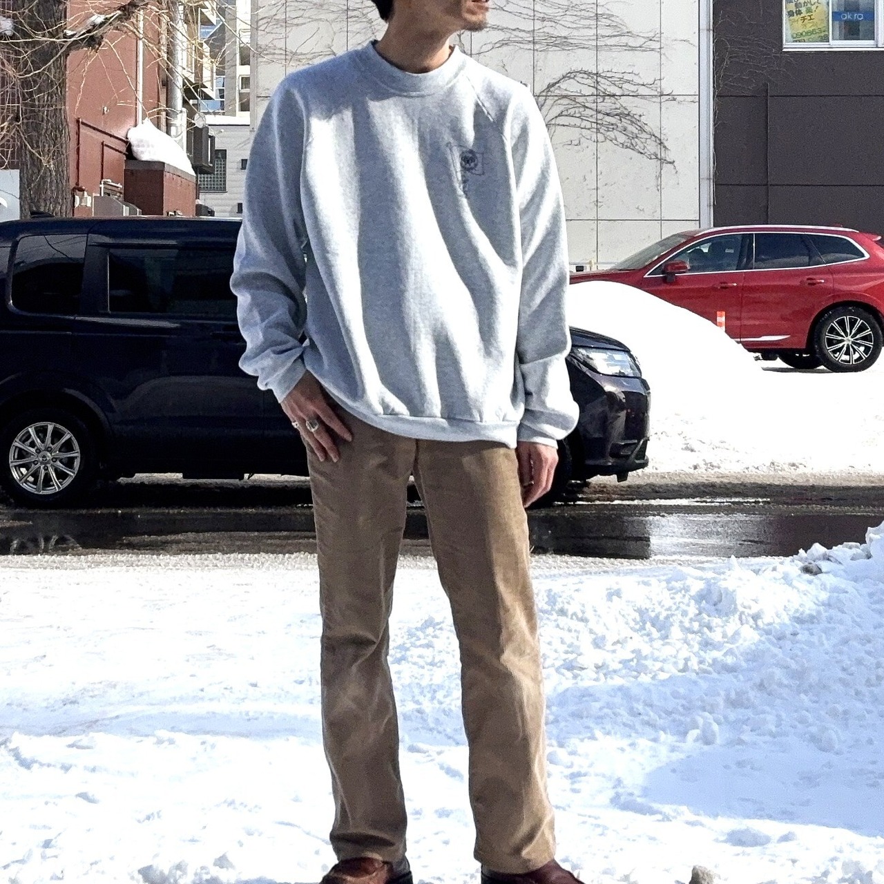 鉄板の杢グレーからシンプル胸ロゴの一着。