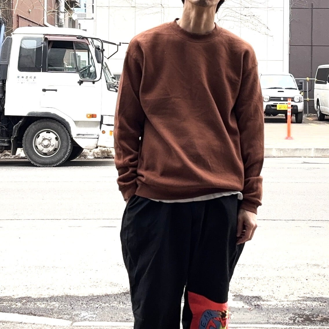 スウェットでありながらカジュアル過ぎず、ニット感覚で着用可能なのがブラウンです。